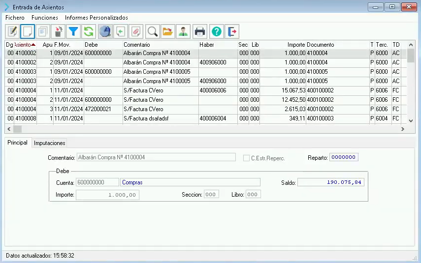 Mejora destacada: Permite adjuntar ficheros y soporte documental a asientos y movimientos bancarios, con acceso desde interrelación.